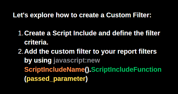 For this first let's create a new Script Include that will be our Custom Filter (later we will improve useability by creating a Dynamic Filter: